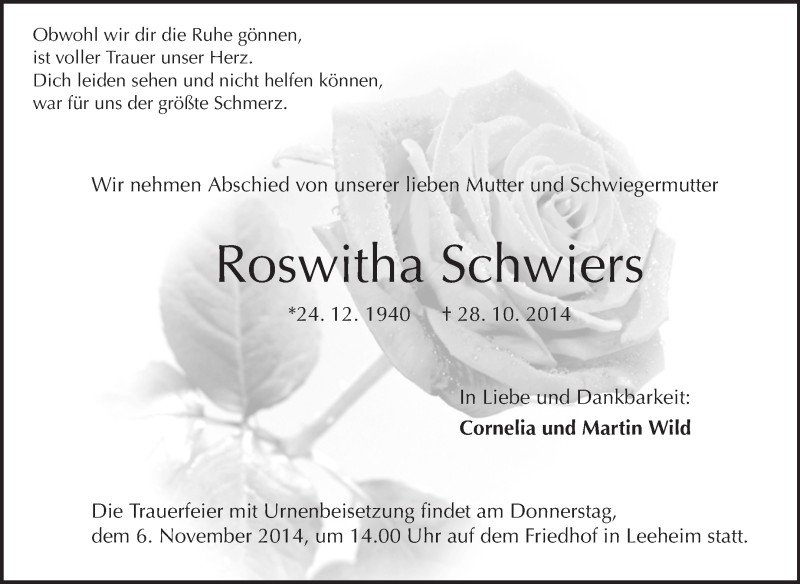 Hier finden Sie alle Traueranzeigen aus der Zeitung, die bisher für Roswitha Schwiers erschienen sind. Weitere Traueranzeigen, die in der Zeitung erscheinen, werden hier ebenfalls aufgelistet