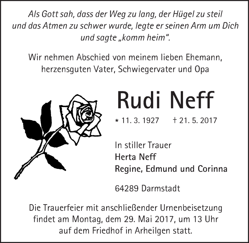 Hier finden Sie alle Traueranzeigen aus der Zeitung, die bisher für Rudi Neff erschienen sind. Weitere Traueranzeigen, die in der Zeitung erscheinen, werden hier ebenfalls aufgelistet