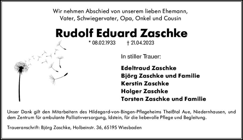 Hier finden Sie alle Traueranzeigen aus der Zeitung, die bisher für Rudolf Eduard Zaschke erschienen sind. Weitere Traueranzeigen, die in der Zeitung erscheinen, werden hier ebenfalls aufgelistet