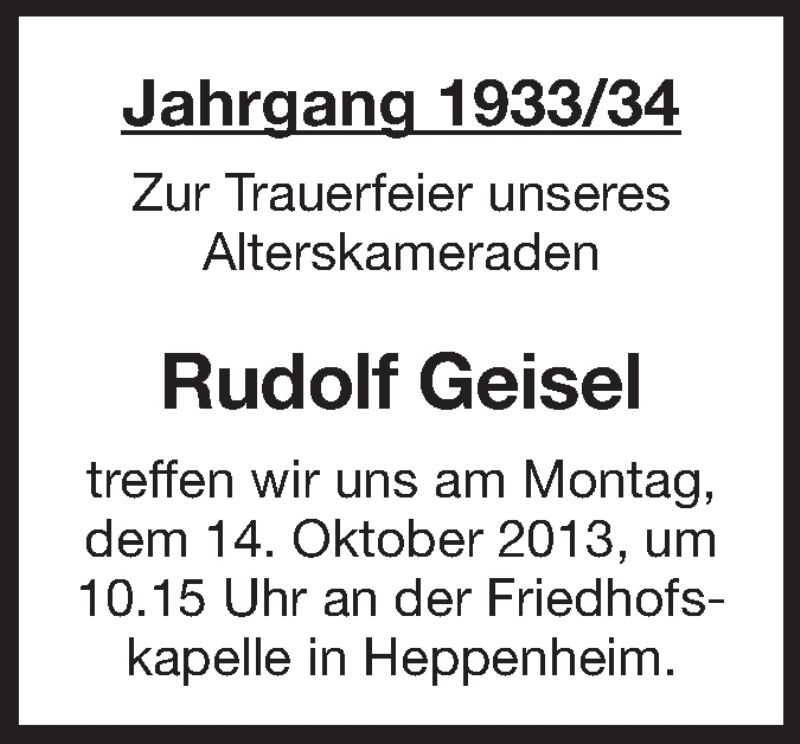 Hier finden Sie alle Traueranzeigen aus der Zeitung, die bisher für Rudolf Geisel erschienen sind. Weitere Traueranzeigen, die in der Zeitung erscheinen, werden hier ebenfalls aufgelistet