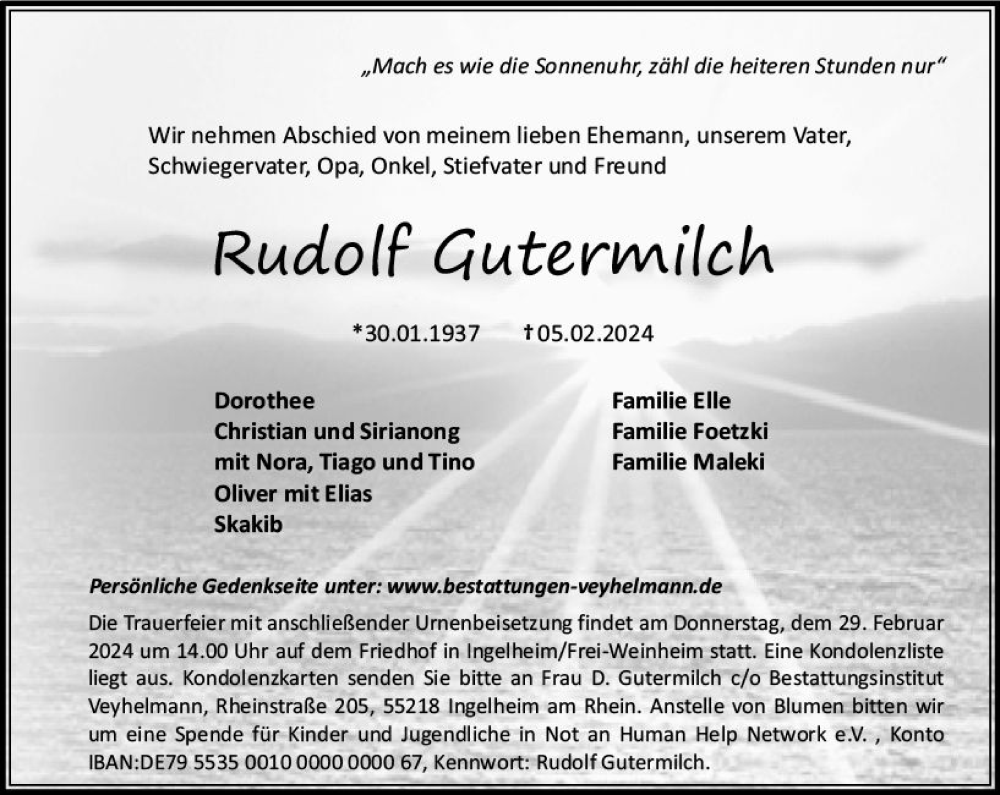 Hier finden Sie alle Traueranzeigen aus der Zeitung, die bisher für Rudolf Gutermilch erschienen sind. Weitere Traueranzeigen, die in der Zeitung erscheinen, werden hier ebenfalls aufgelistet