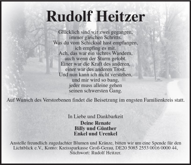 Hier finden Sie alle Traueranzeigen aus der Zeitung, die bisher für Rudolf Heitzer erschienen sind. Weitere Traueranzeigen, die in der Zeitung erscheinen, werden hier ebenfalls aufgelistet