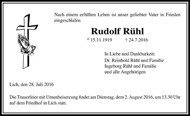 Hier finden Sie alle Traueranzeigen aus der Zeitung, die bisher für Rudolf Rühl erschienen sind. Weitere Traueranzeigen, die in der Zeitung erscheinen, werden hier ebenfalls aufgelistet