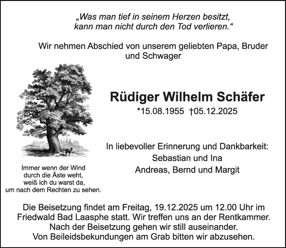 Hier finden Sie alle Traueranzeigen aus der Zeitung, die bisher für Rüdiger Wilhelm Schäfer erschienen sind. Weitere Traueranzeigen, die in der Zeitung erscheinen, werden hier ebenfalls aufgelistet
