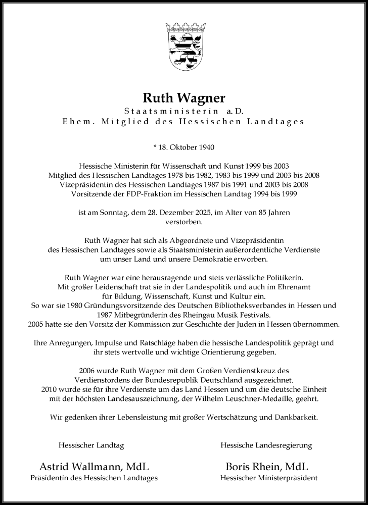 Hier finden Sie alle Traueranzeigen aus der Zeitung, die bisher für Ruth Wagner erschienen sind. Weitere Traueranzeigen, die in der Zeitung erscheinen, werden hier ebenfalls aufgelistet
