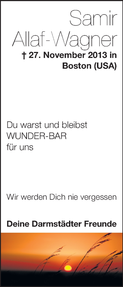 Hier finden Sie alle Traueranzeigen aus der Zeitung, die bisher für Samir Allaf-Wagner erschienen sind. Weitere Traueranzeigen, die in der Zeitung erscheinen, werden hier ebenfalls aufgelistet