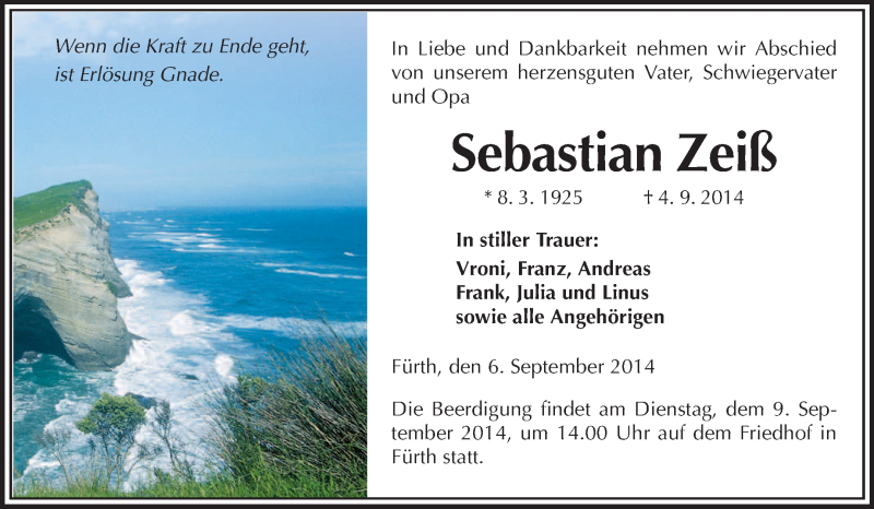 Hier finden Sie alle Traueranzeigen aus der Zeitung, die bisher für Sebastian Zeiß erschienen sind. Weitere Traueranzeigen, die in der Zeitung erscheinen, werden hier ebenfalls aufgelistet