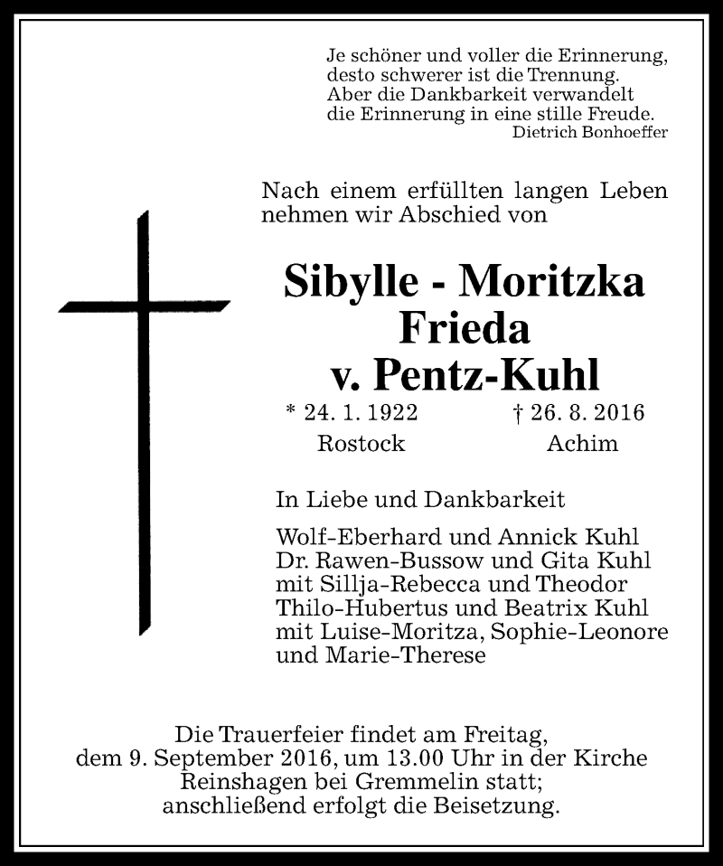 Hier finden Sie alle Traueranzeigen aus der Zeitung, die bisher für Sibylle-Moritzka Frieda v. Pentz-Kuhl erschienen sind. Weitere Traueranzeigen, die in der Zeitung erscheinen, werden hier ebenfalls aufgelistet