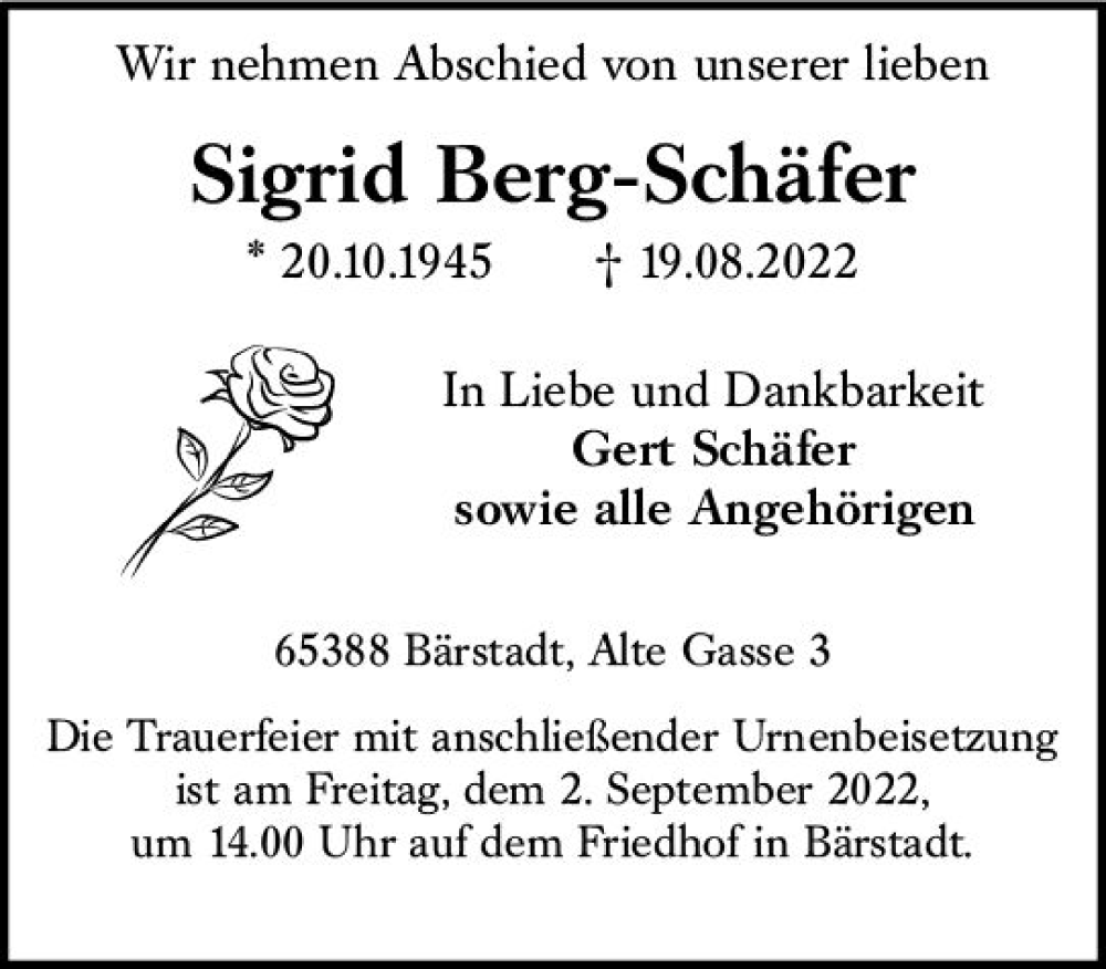 Hier finden Sie alle Traueranzeigen aus der Zeitung, die bisher für Sigrid Berg-Schäfer erschienen sind. Weitere Traueranzeigen, die in der Zeitung erscheinen, werden hier ebenfalls aufgelistet