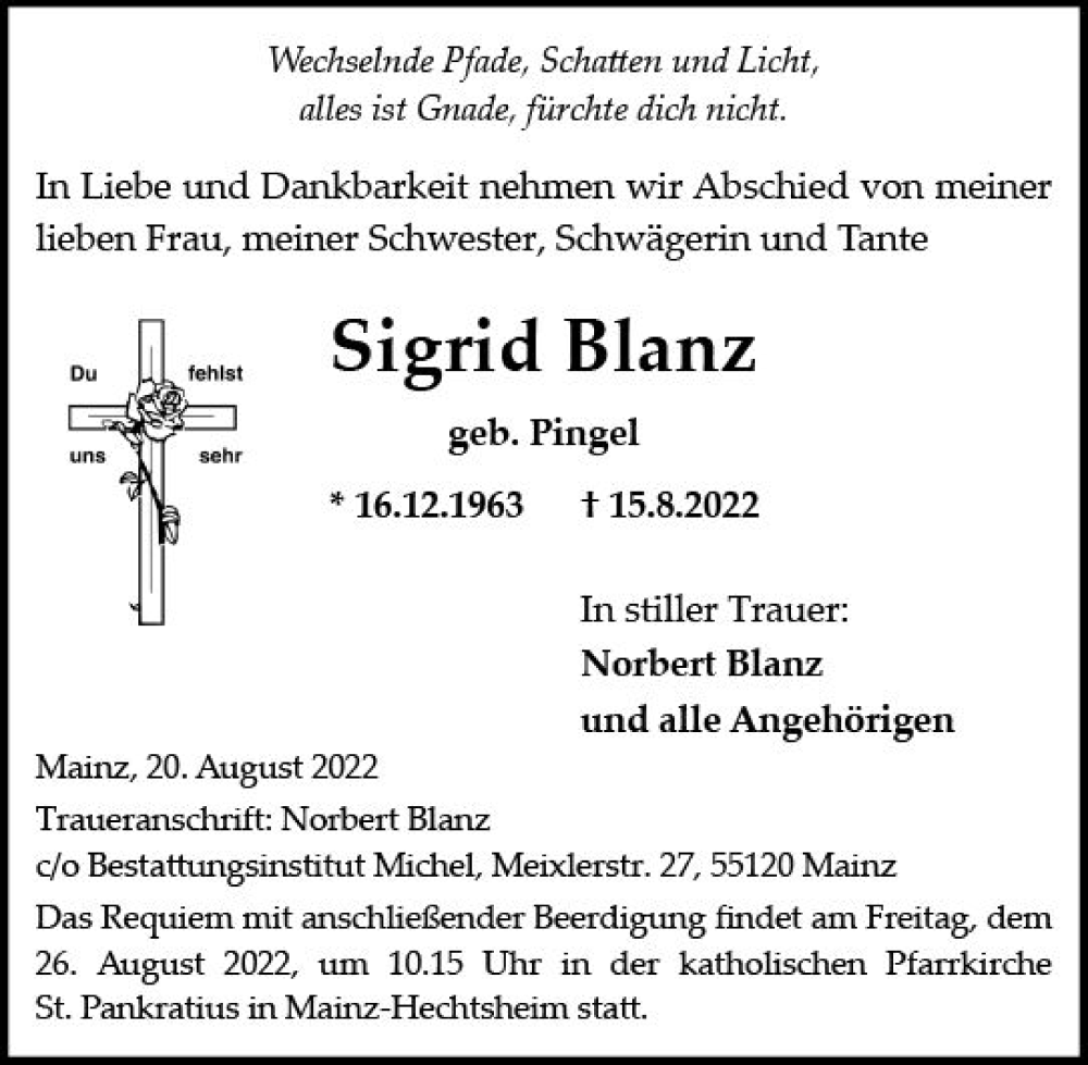 Hier finden Sie alle Traueranzeigen aus der Zeitung, die bisher für Sigrid Blanz erschienen sind. Weitere Traueranzeigen, die in der Zeitung erscheinen, werden hier ebenfalls aufgelistet