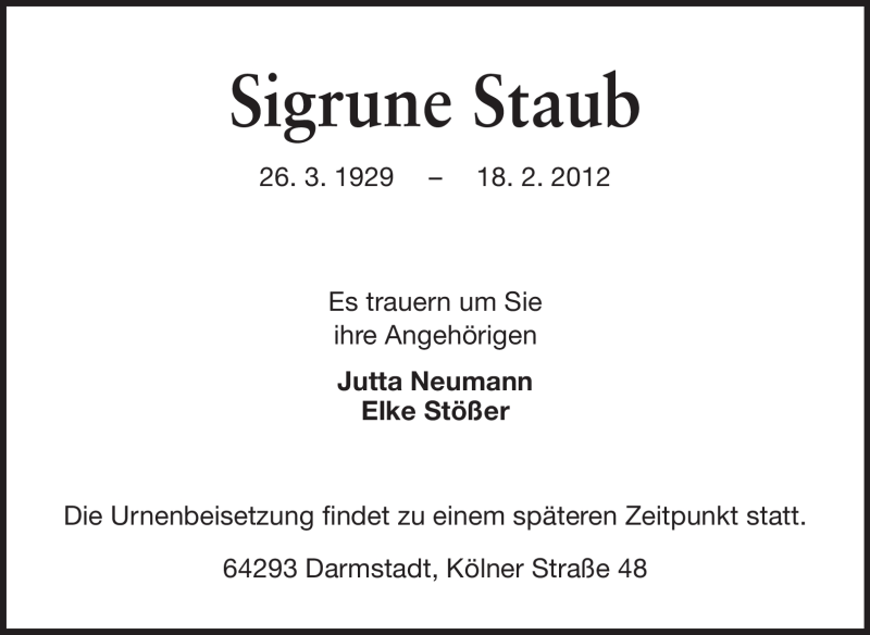 Hier finden Sie alle Traueranzeigen aus der Zeitung, die bisher für Sigrune Staub erschienen sind. Weitere Traueranzeigen, die in der Zeitung erscheinen, werden hier ebenfalls aufgelistet