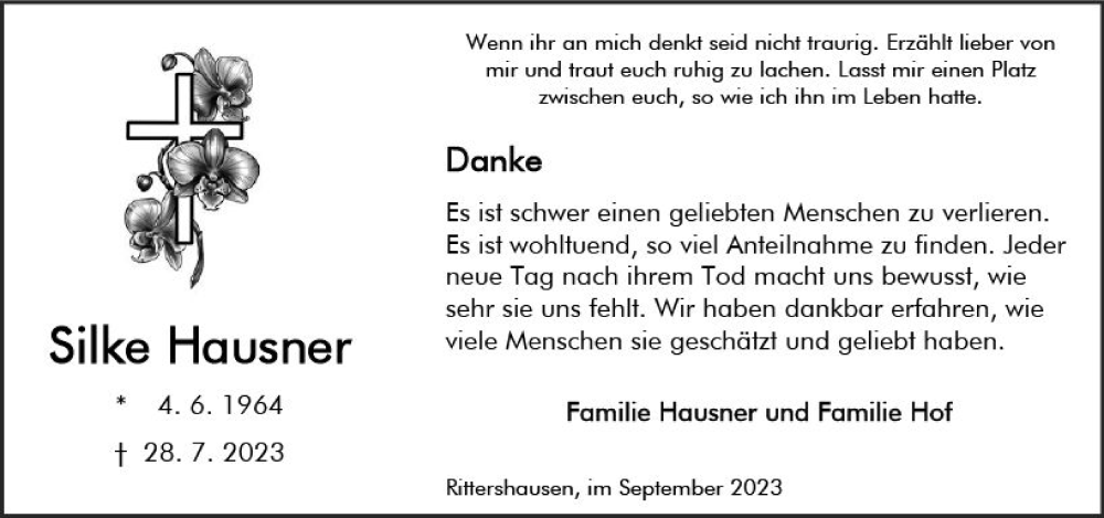 Hier finden Sie alle Traueranzeigen aus der Zeitung, die bisher für Silke Hausner erschienen sind. Weitere Traueranzeigen, die in der Zeitung erscheinen, werden hier ebenfalls aufgelistet
