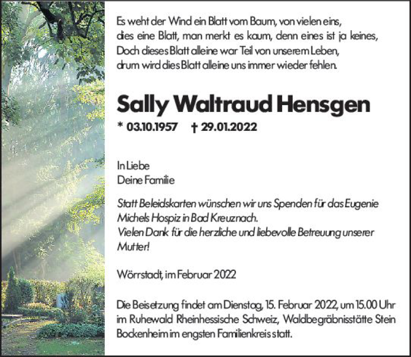 Hier finden Sie alle Traueranzeigen aus der Zeitung, die bisher für Sony Waltraud Hensgen erschienen sind. Weitere Traueranzeigen, die in der Zeitung erscheinen, werden hier ebenfalls aufgelistet