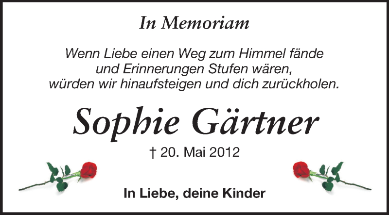 Hier finden Sie alle Traueranzeigen aus der Zeitung, die bisher für Sophie Gärtner erschienen sind. Weitere Traueranzeigen, die in der Zeitung erscheinen, werden hier ebenfalls aufgelistet