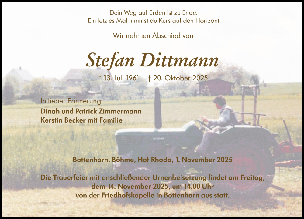 Hier finden Sie alle Traueranzeigen aus der Zeitung, die bisher für Stefan Dittmann erschienen sind. Weitere Traueranzeigen, die in der Zeitung erscheinen, werden hier ebenfalls aufgelistet