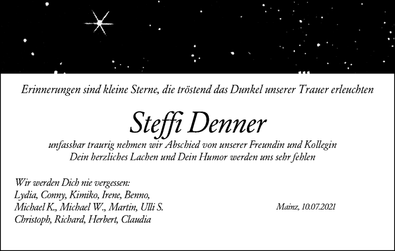 Hier finden Sie alle Traueranzeigen aus der Zeitung, die bisher für Steffi Denner erschienen sind. Weitere Traueranzeigen, die in der Zeitung erscheinen, werden hier ebenfalls aufgelistet