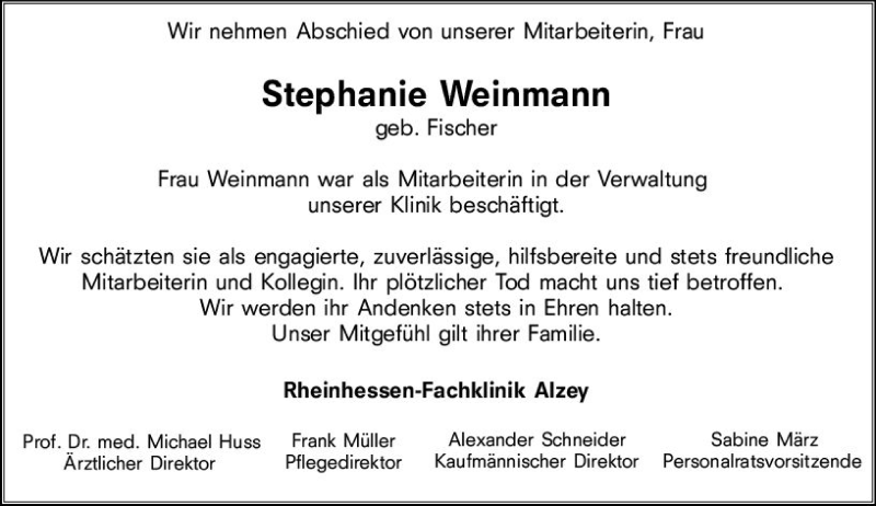 Hier finden Sie alle Traueranzeigen aus der Zeitung, die bisher für Stephanie Weinmann erschienen sind. Weitere Traueranzeigen, die in der Zeitung erscheinen, werden hier ebenfalls aufgelistet