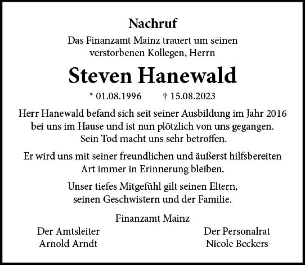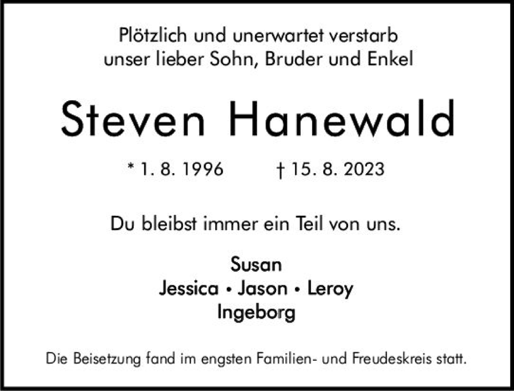 Hier finden Sie alle Traueranzeigen aus der Zeitung, die bisher für Steven Hanewald erschienen sind. Weitere Traueranzeigen, die in der Zeitung erscheinen, werden hier ebenfalls aufgelistet