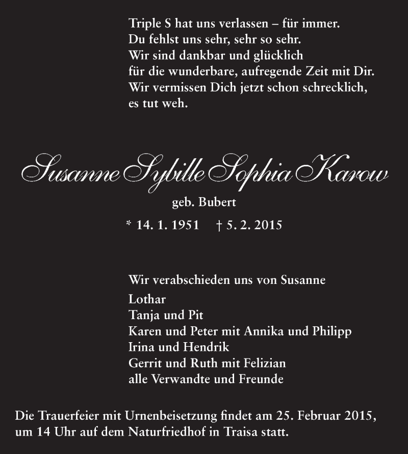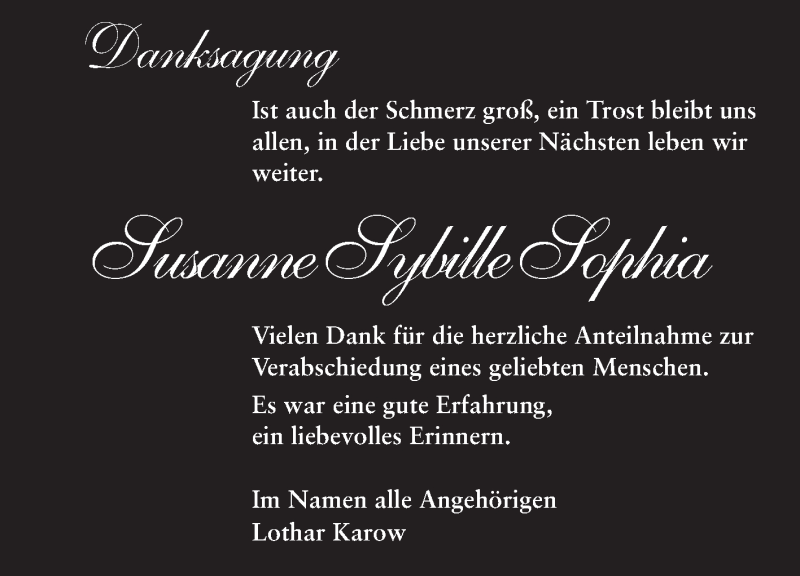 Hier finden Sie alle Traueranzeigen aus der Zeitung, die bisher für Susanne Sybille Sophia Karow erschienen sind. Weitere Traueranzeigen, die in der Zeitung erscheinen, werden hier ebenfalls aufgelistet