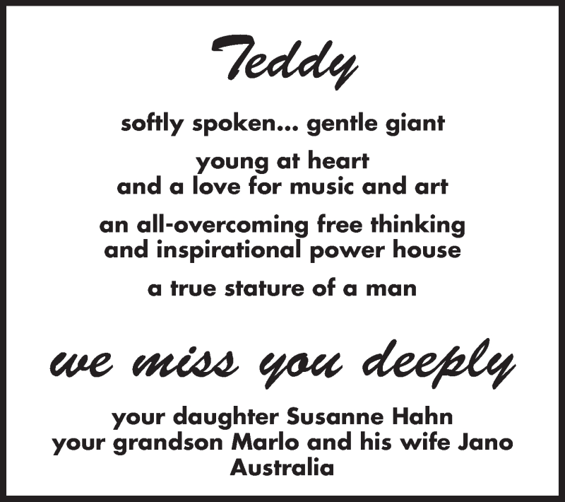 Hier finden Sie alle Traueranzeigen aus der Zeitung, die bisher für Teddy Hahn erschienen sind. Weitere Traueranzeigen, die in der Zeitung erscheinen, werden hier ebenfalls aufgelistet
