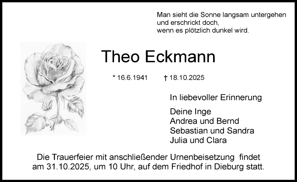 Hier finden Sie alle Traueranzeigen aus der Zeitung, die bisher für Theo Eckmann erschienen sind. Weitere Traueranzeigen, die in der Zeitung erscheinen, werden hier ebenfalls aufgelistet