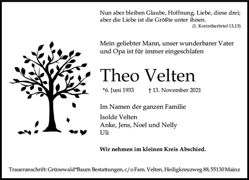Hier finden Sie alle Traueranzeigen aus der Zeitung, die bisher für Theo Velten erschienen sind. Weitere Traueranzeigen, die in der Zeitung erscheinen, werden hier ebenfalls aufgelistet