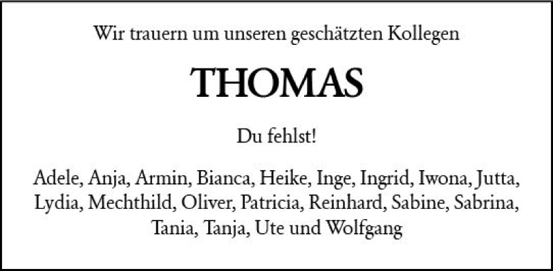 Hier finden Sie alle Traueranzeigen aus der Zeitung, die bisher für Thomas erschienen sind. Weitere Traueranzeigen, die in der Zeitung erscheinen, werden hier ebenfalls aufgelistet