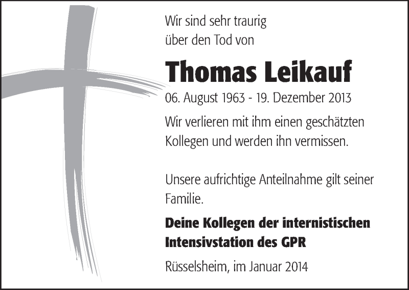 Hier finden Sie alle Traueranzeigen aus der Zeitung, die bisher für Thomas Leikauf erschienen sind. Weitere Traueranzeigen, die in der Zeitung erscheinen, werden hier ebenfalls aufgelistet