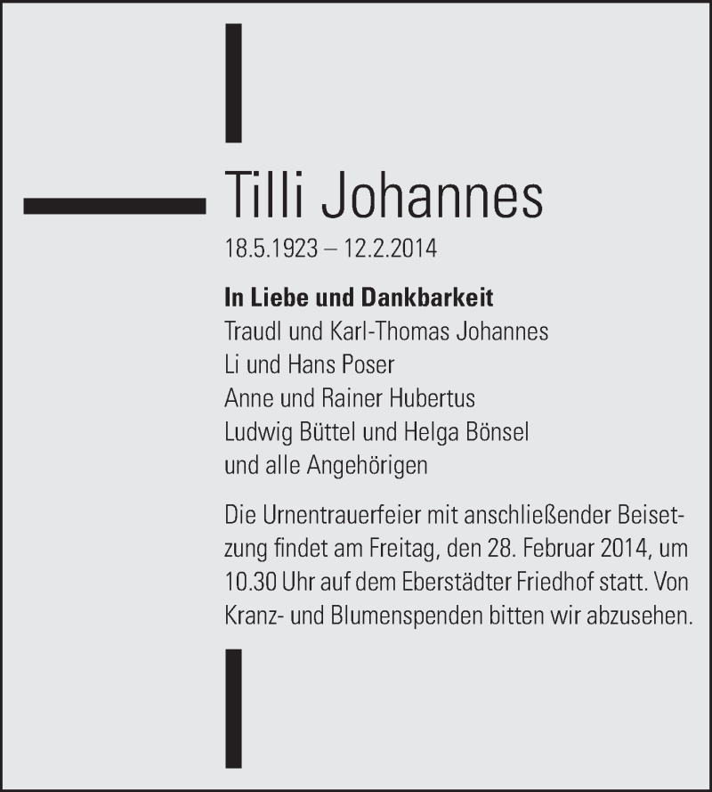 Hier finden Sie alle Traueranzeigen aus der Zeitung, die bisher für Tilli Johannes erschienen sind. Weitere Traueranzeigen, die in der Zeitung erscheinen, werden hier ebenfalls aufgelistet
