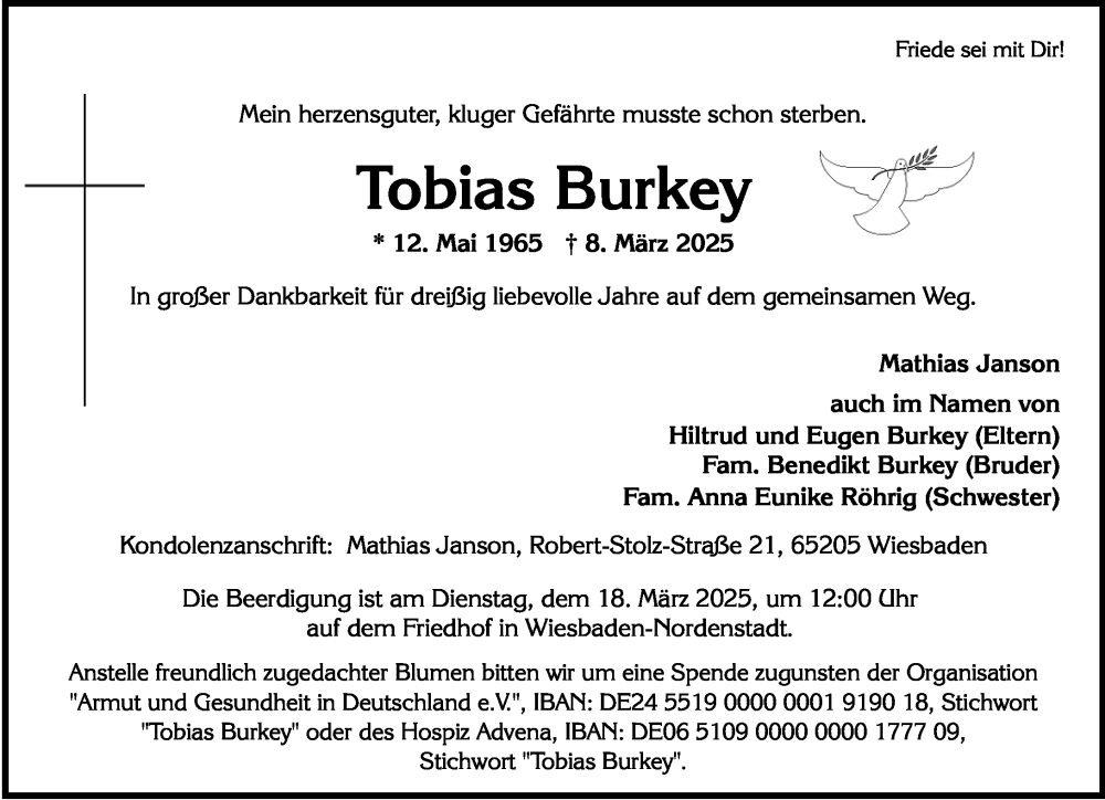Hier finden Sie alle Traueranzeigen aus der Zeitung, die bisher für Tobias Burkey erschienen sind. Weitere Traueranzeigen, die in der Zeitung erscheinen, werden hier ebenfalls aufgelistet