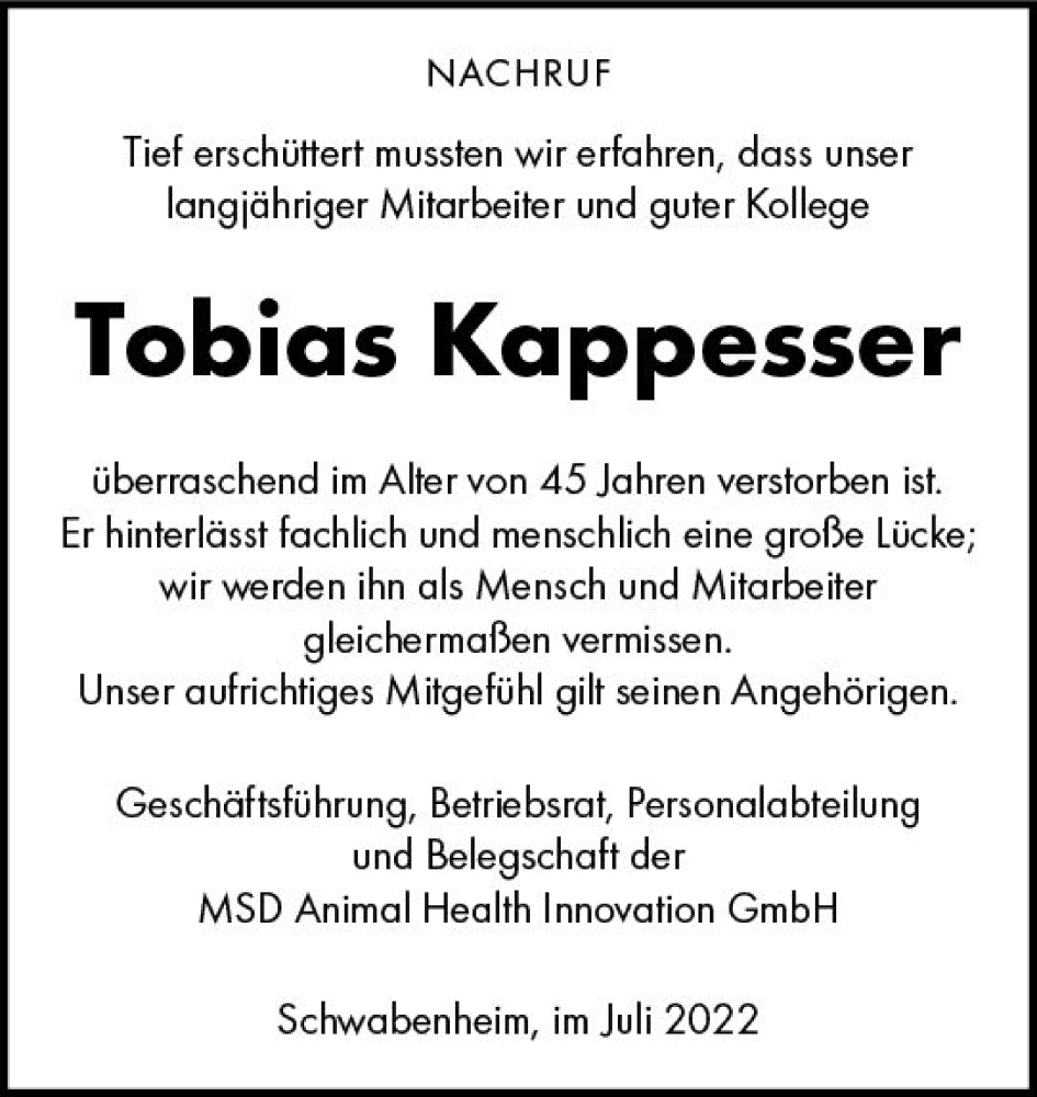Hier finden Sie alle Traueranzeigen aus der Zeitung, die bisher für Tobias Kappesser erschienen sind. Weitere Traueranzeigen, die in der Zeitung erscheinen, werden hier ebenfalls aufgelistet