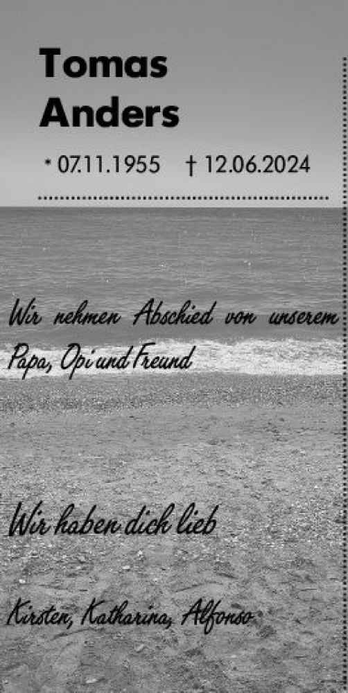 Hier finden Sie alle Traueranzeigen aus der Zeitung, die bisher für Tomas Anders erschienen sind. Weitere Traueranzeigen, die in der Zeitung erscheinen, werden hier ebenfalls aufgelistet