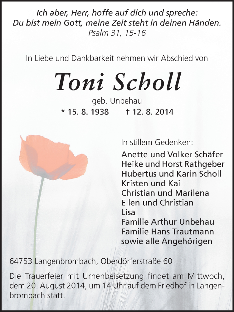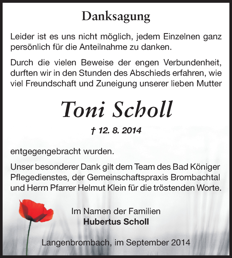 Hier finden Sie alle Traueranzeigen aus der Zeitung, die bisher für Toni Scholl erschienen sind. Weitere Traueranzeigen, die in der Zeitung erscheinen, werden hier ebenfalls aufgelistet