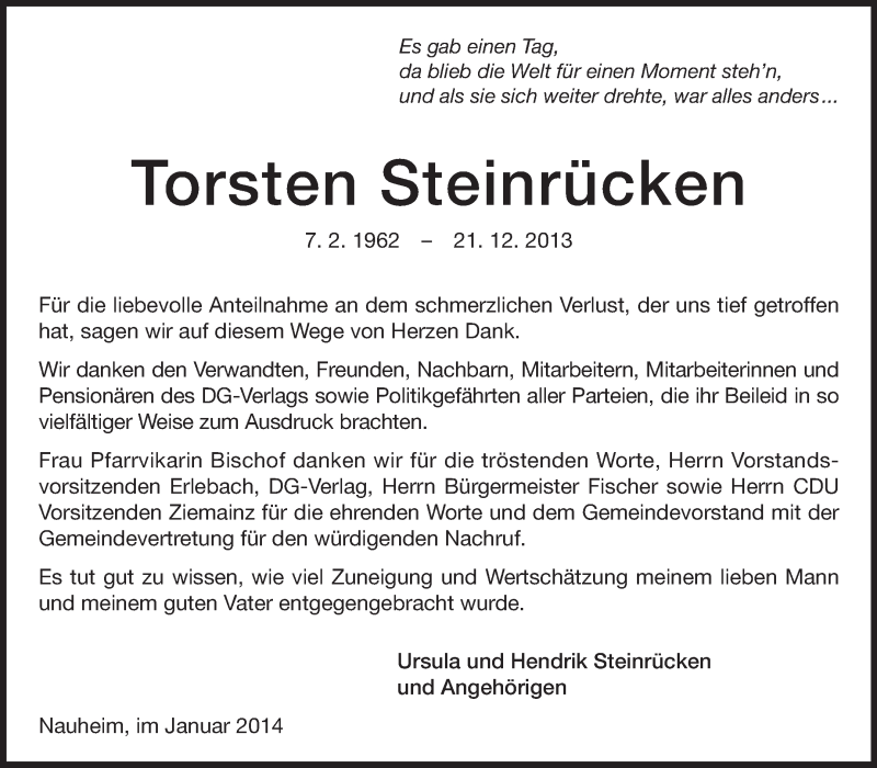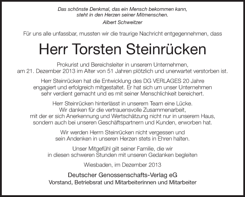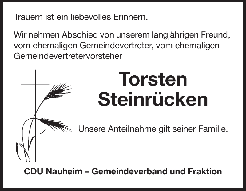 Hier finden Sie alle Traueranzeigen aus der Zeitung, die bisher für Torsten Steinrücken erschienen sind. Weitere Traueranzeigen, die in der Zeitung erscheinen, werden hier ebenfalls aufgelistet