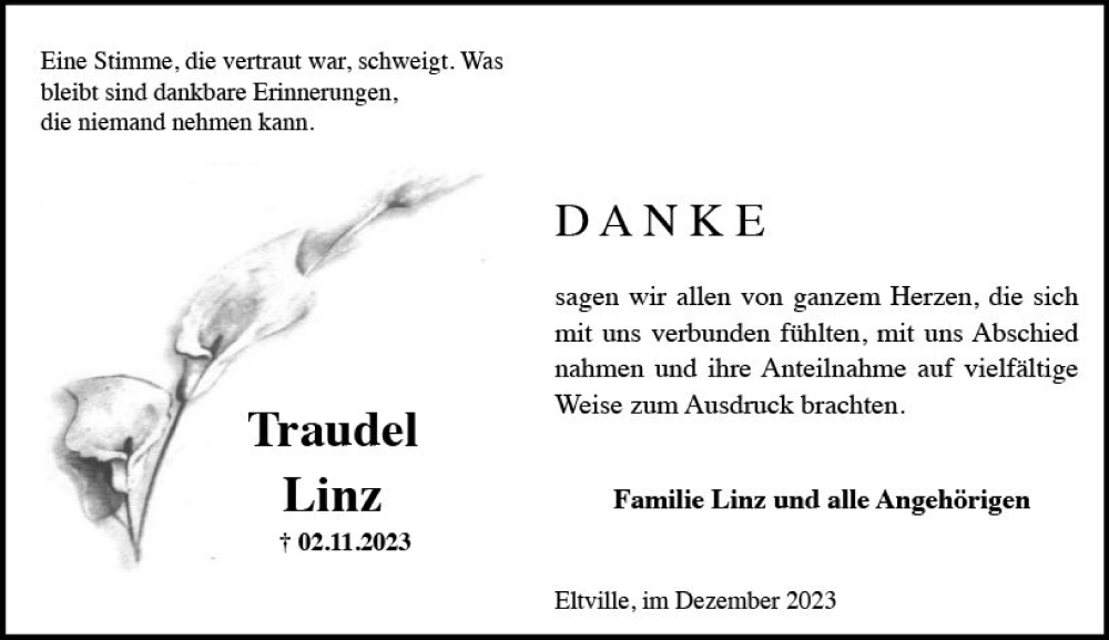 Hier finden Sie alle Traueranzeigen aus der Zeitung, die bisher für Traudel Linz erschienen sind. Weitere Traueranzeigen, die in der Zeitung erscheinen, werden hier ebenfalls aufgelistet
