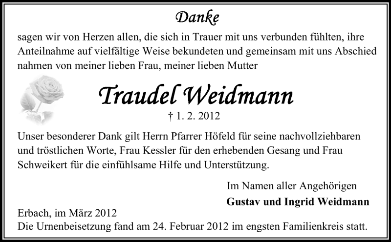 Hier finden Sie alle Traueranzeigen aus der Zeitung, die bisher für Traudel Weidmann erschienen sind. Weitere Traueranzeigen, die in der Zeitung erscheinen, werden hier ebenfalls aufgelistet