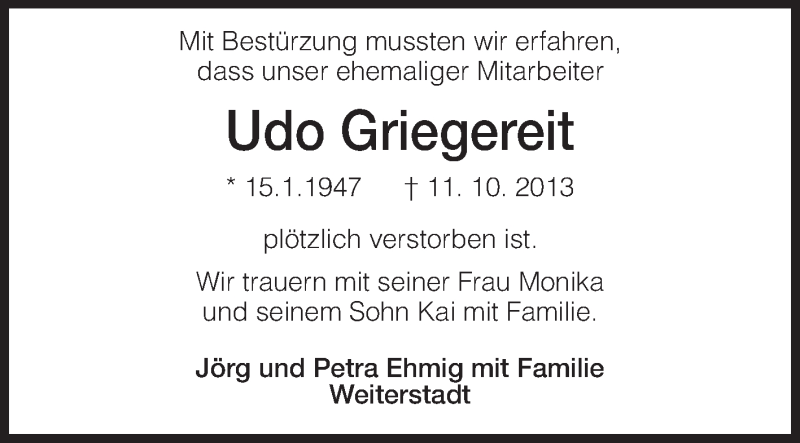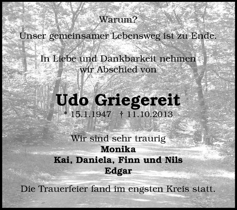Hier finden Sie alle Traueranzeigen aus der Zeitung, die bisher für Udo Griegereit erschienen sind. Weitere Traueranzeigen, die in der Zeitung erscheinen, werden hier ebenfalls aufgelistet
