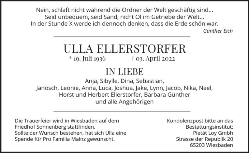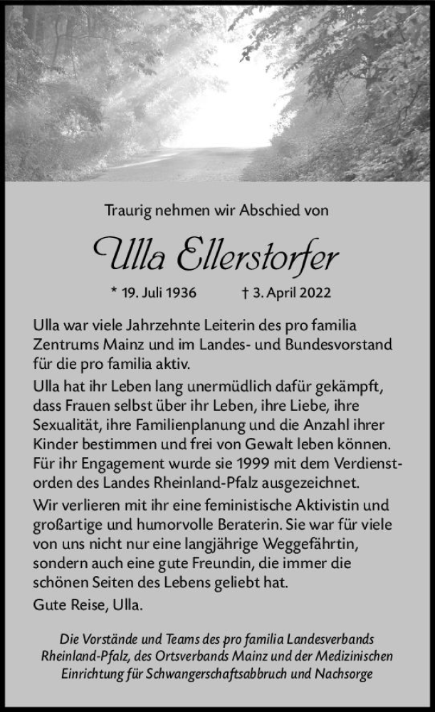 Hier finden Sie alle Traueranzeigen aus der Zeitung, die bisher für Ulla Ellerstorfer erschienen sind. Weitere Traueranzeigen, die in der Zeitung erscheinen, werden hier ebenfalls aufgelistet