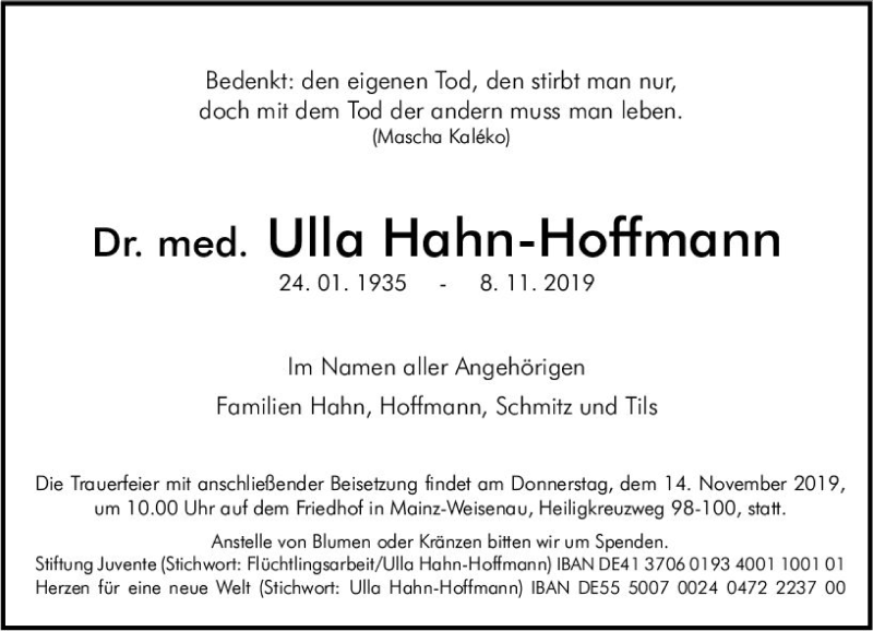 Hier finden Sie alle Traueranzeigen aus der Zeitung, die bisher für Ulla Hahn-Hoffmann erschienen sind. Weitere Traueranzeigen, die in der Zeitung erscheinen, werden hier ebenfalls aufgelistet