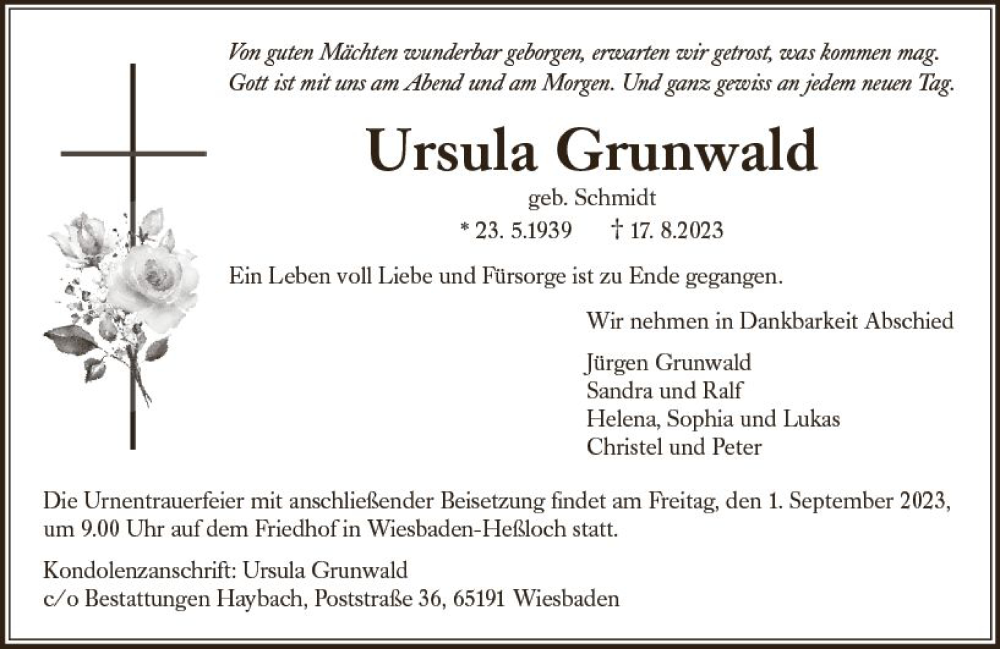 Hier finden Sie alle Traueranzeigen aus der Zeitung, die bisher für Ursula Grunwald erschienen sind. Weitere Traueranzeigen, die in der Zeitung erscheinen, werden hier ebenfalls aufgelistet
