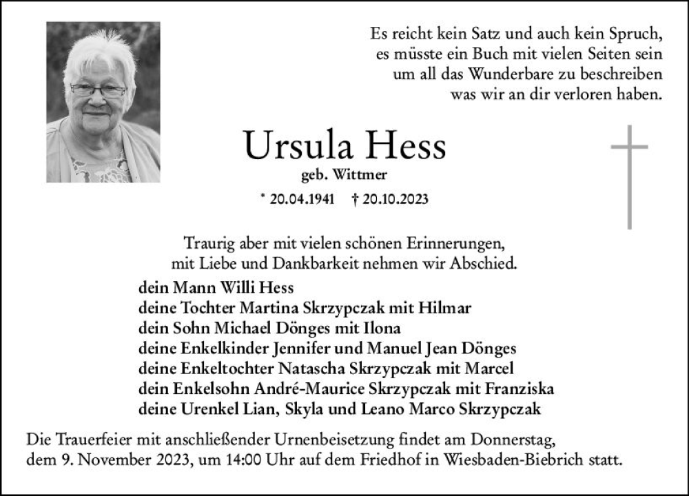 Hier finden Sie alle Traueranzeigen aus der Zeitung, die bisher für Ursula Hess erschienen sind. Weitere Traueranzeigen, die in der Zeitung erscheinen, werden hier ebenfalls aufgelistet