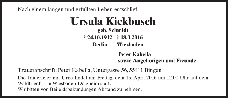 Hier finden Sie alle Traueranzeigen aus der Zeitung, die bisher für Ursula Kickbusch erschienen sind. Weitere Traueranzeigen, die in der Zeitung erscheinen, werden hier ebenfalls aufgelistet