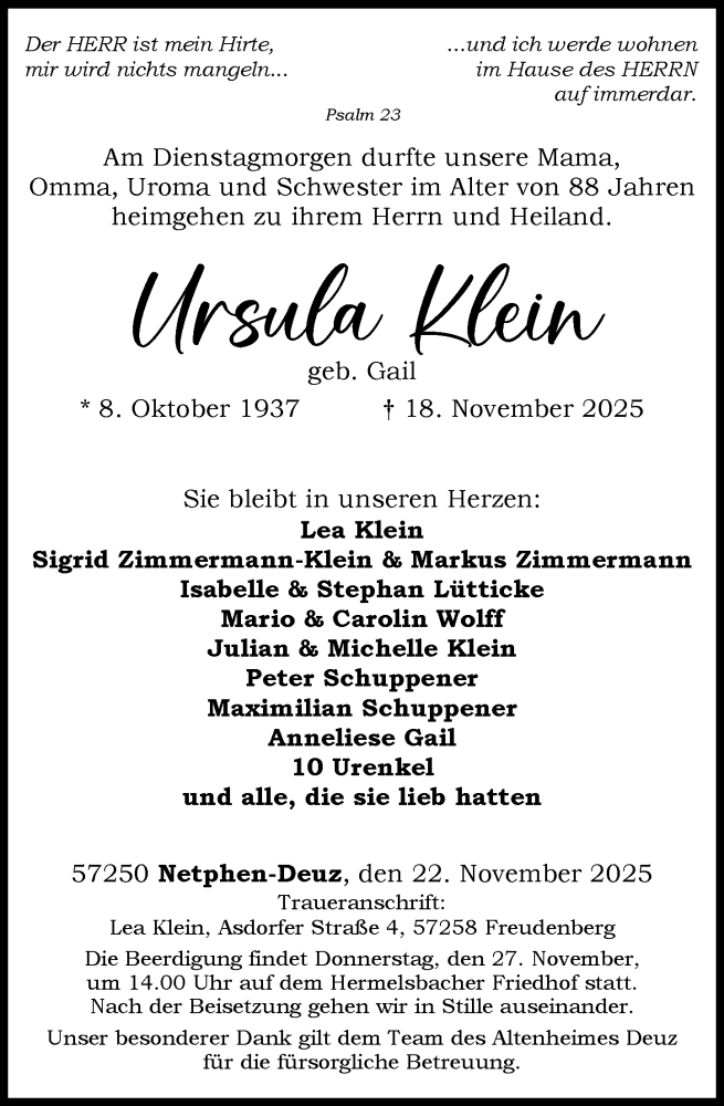 Hier finden Sie alle Traueranzeigen aus der Zeitung, die bisher für Ursula Klein erschienen sind. Weitere Traueranzeigen, die in der Zeitung erscheinen, werden hier ebenfalls aufgelistet