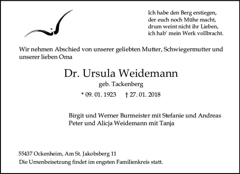 Hier finden Sie alle Traueranzeigen aus der Zeitung, die bisher für Ursula Weidemann erschienen sind. Weitere Traueranzeigen, die in der Zeitung erscheinen, werden hier ebenfalls aufgelistet