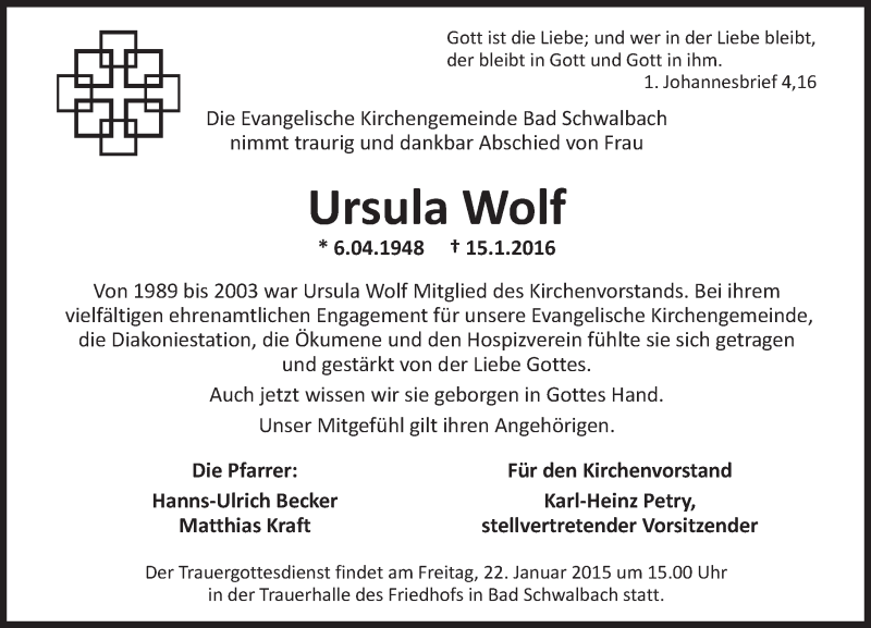 Hier finden Sie alle Traueranzeigen aus der Zeitung, die bisher für Ursula Wolf erschienen sind. Weitere Traueranzeigen, die in der Zeitung erscheinen, werden hier ebenfalls aufgelistet
