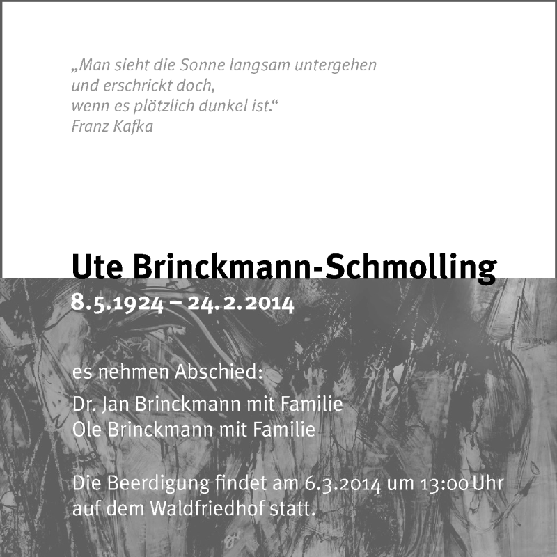 Hier finden Sie alle Traueranzeigen aus der Zeitung, die bisher für Ute Brinckmann-Schmolling erschienen sind. Weitere Traueranzeigen, die in der Zeitung erscheinen, werden hier ebenfalls aufgelistet