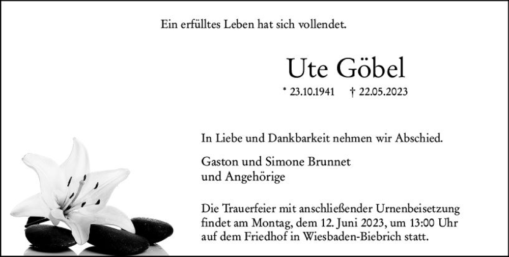 Hier finden Sie alle Traueranzeigen aus der Zeitung, die bisher für Ute Göbel erschienen sind. Weitere Traueranzeigen, die in der Zeitung erscheinen, werden hier ebenfalls aufgelistet