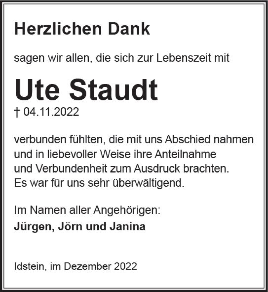 Hier finden Sie alle Traueranzeigen aus der Zeitung, die bisher für Ute Staudt erschienen sind. Weitere Traueranzeigen, die in der Zeitung erscheinen, werden hier ebenfalls aufgelistet
