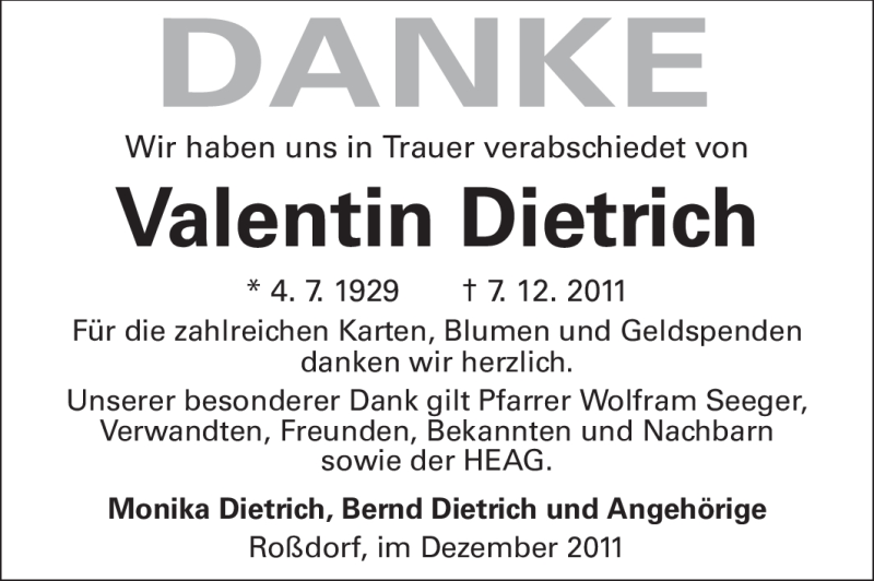 Hier finden Sie alle Traueranzeigen aus der Zeitung, die bisher für Valentin Dietrich erschienen sind. Weitere Traueranzeigen, die in der Zeitung erscheinen, werden hier ebenfalls aufgelistet