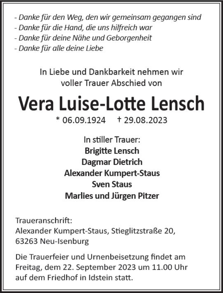Hier finden Sie alle Traueranzeigen aus der Zeitung, die bisher für Vera Luise-Lotte Lensch erschienen sind. Weitere Traueranzeigen, die in der Zeitung erscheinen, werden hier ebenfalls aufgelistet